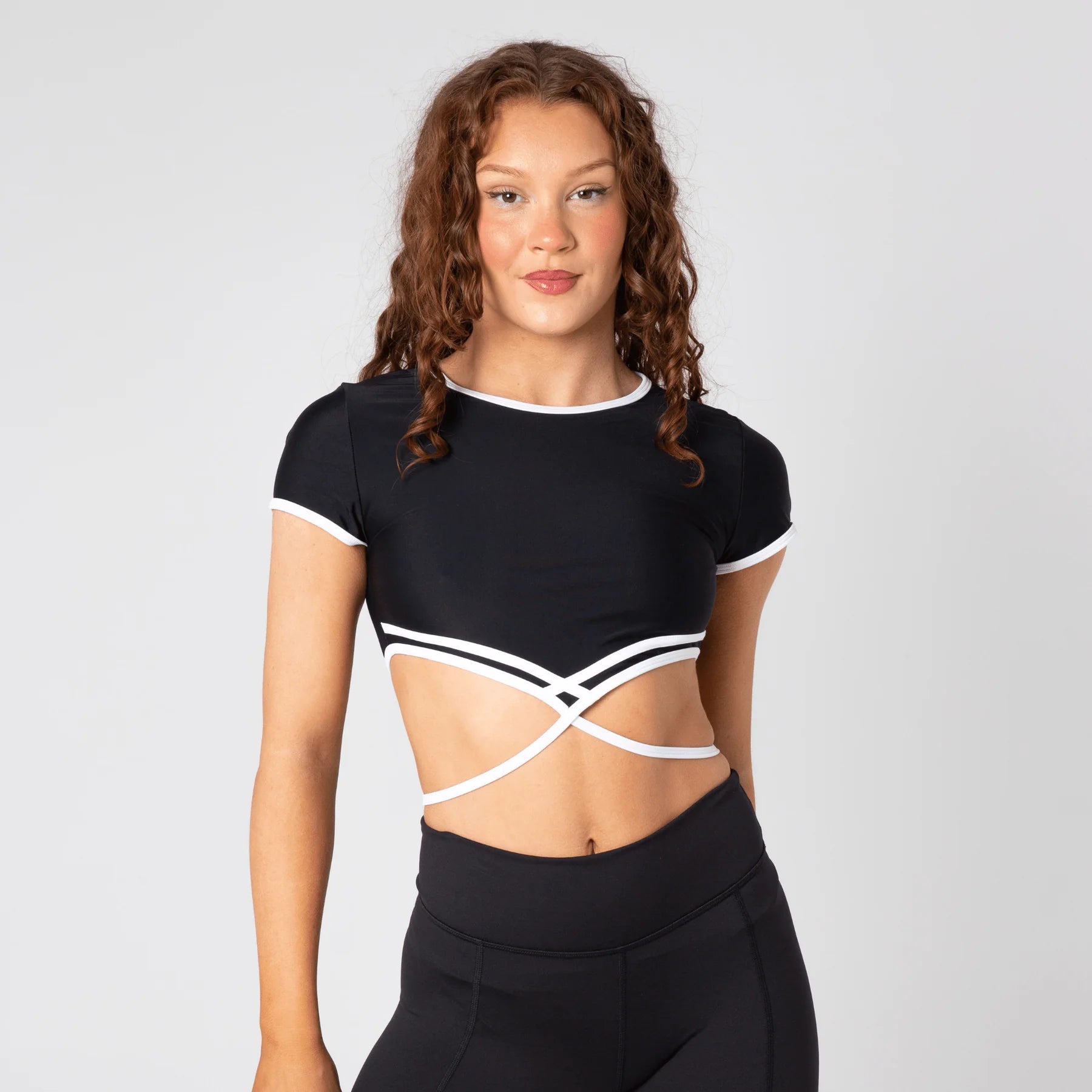 Elevate your performance with our Influence Crop. This stylish and sleek top features capped sleeves and a unique binding detail, complete with a zipper back and wrap tie for a secure fit. Available in a striking two-tone black and white, this crop is perfect for class attire or as a sophisticated uniform piece. Performance ready and designed for the modern day artist.